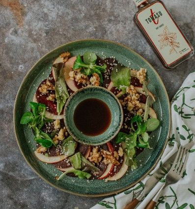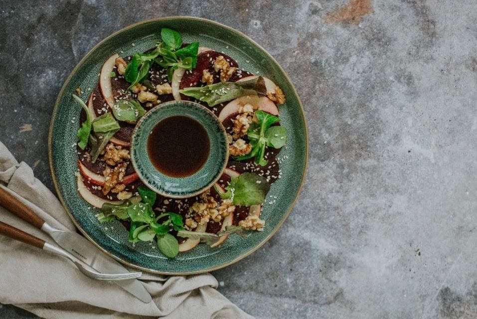 - Disposez les tranches de betterave et de pomme autour, en les faisant se chevaucher. Répartissez la laitue et les noix sur le carpaccio et saupoudrez de graines de sésame.
