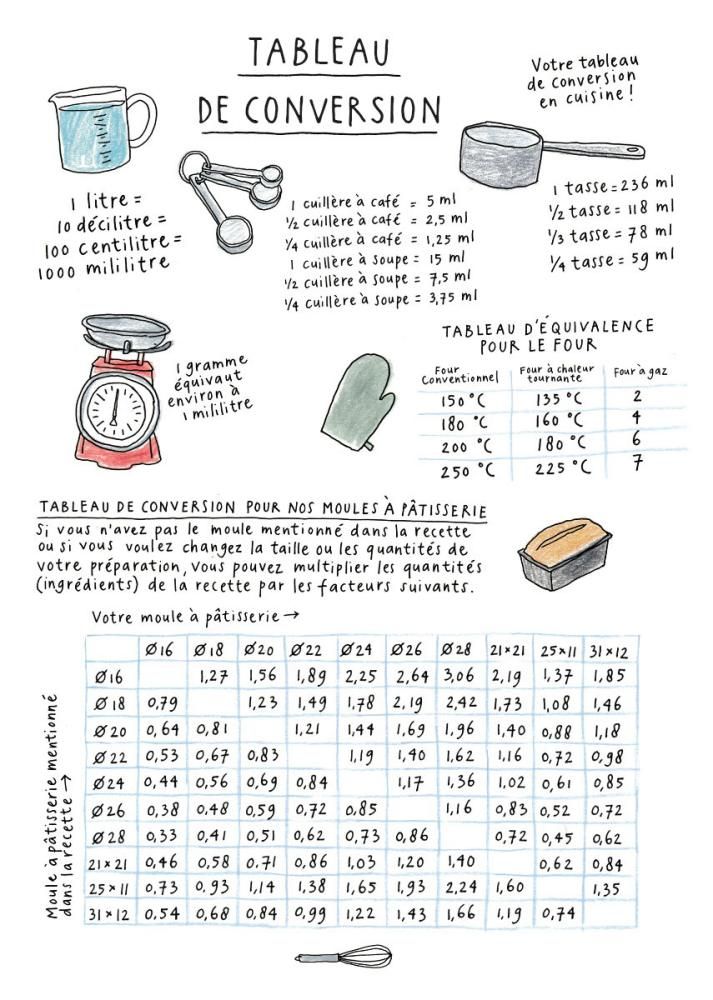 Savez-vous combien de ml il y dans un ‘cup’ ? Et que faire si votre moule à pâtisserie est légèrement plus grand ou plus petit que celui indiqué dans votre recette ? Le sympathique tableau de conversion des mesures de cuisine de Dille & Kamille est une carte ultra pratique à accrocher au réfrigérateur ou à un placard.