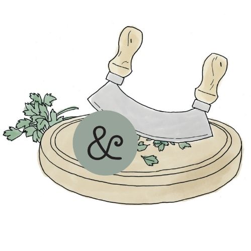 Ce duo vous aidera à hacher facilement et rapidement une grande quantité d'herbes aromatiques fraîches. Placez les herbes aromatiques choisies sur la planche, saisissez les deux poignées du couteau demi-lune et balancez le couteau doucement sur les herbes dans un mouvement de va-et-vient.