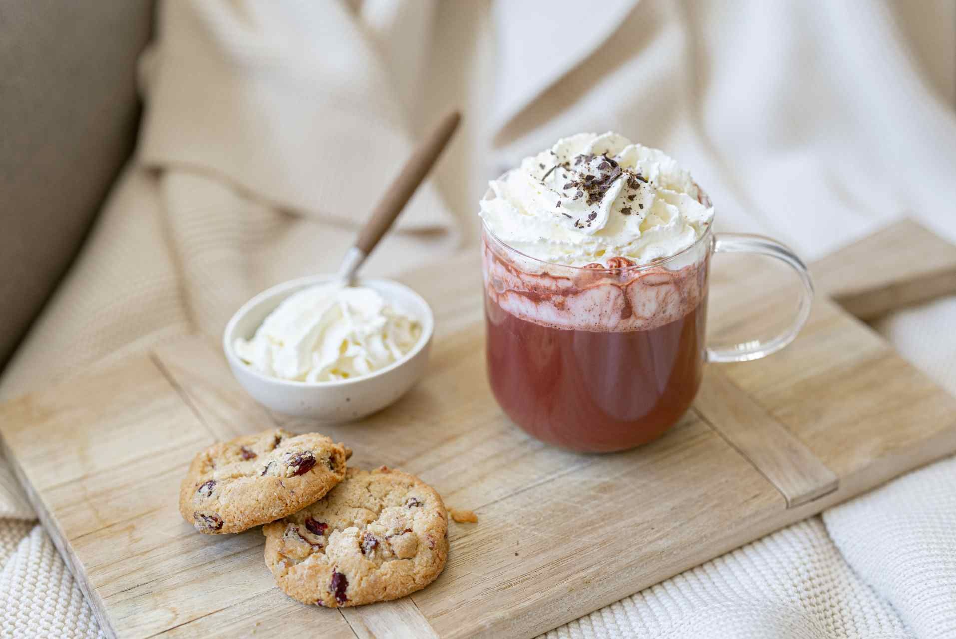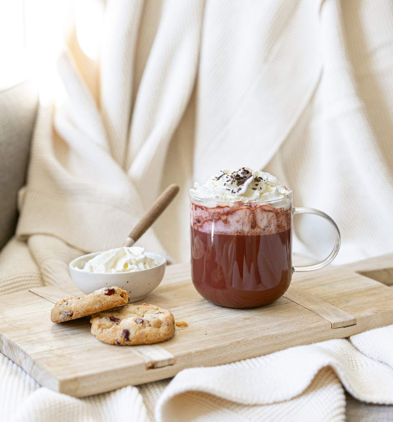 - Servez votre chocolat chaud red velvet avec de la crème fouettée saupoudrée de cacao ou de chocolat râpé.
