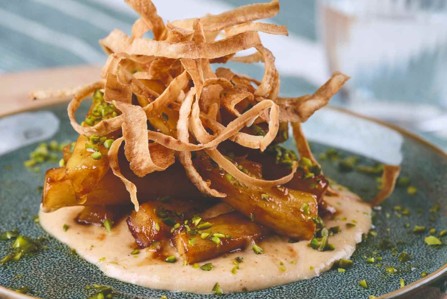 - Recouvrez la crème avec les pelures de panais frites et garnissez avec un peu de ras el hanout et de gros sel marin.