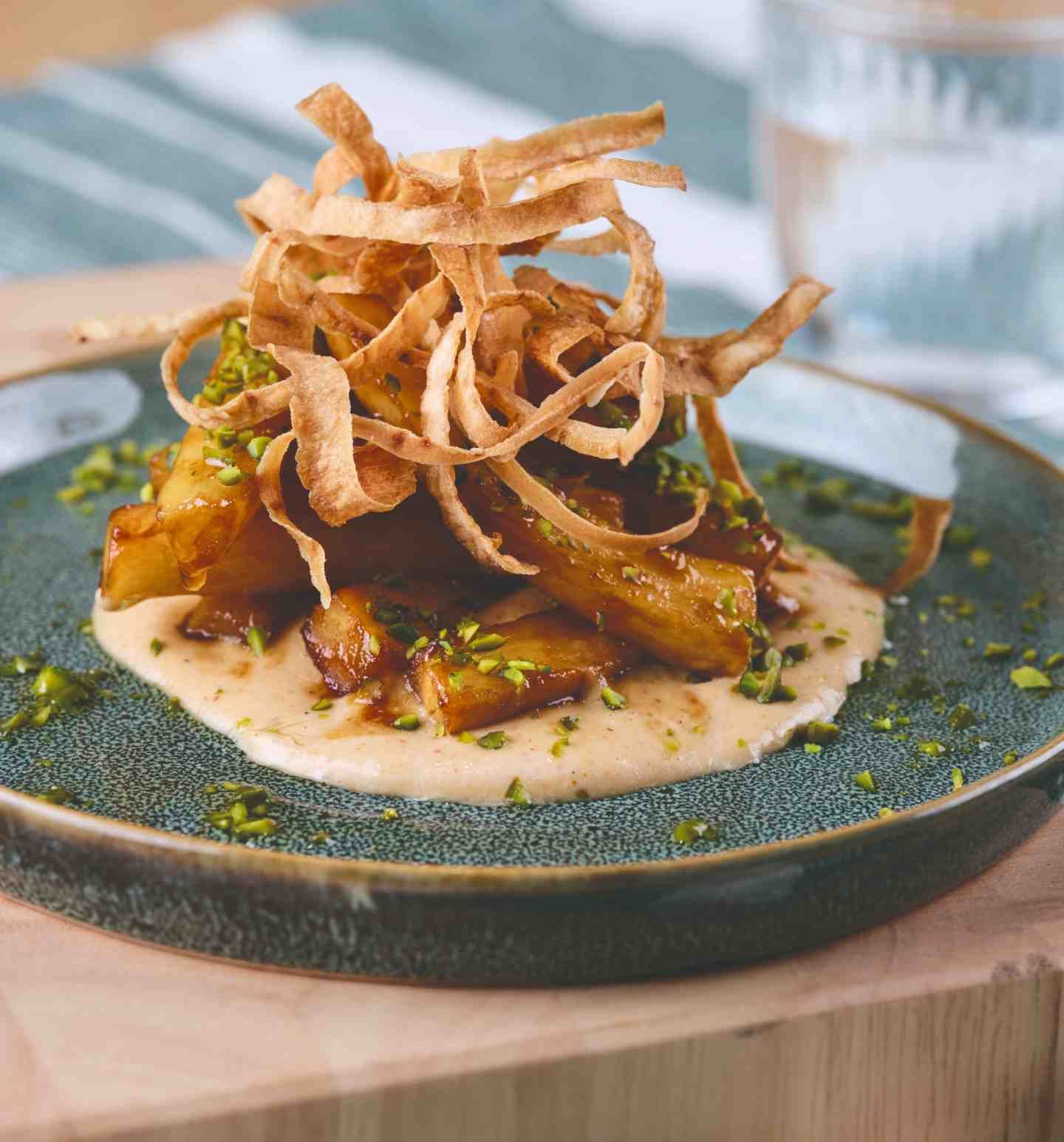- Répartissez la crème au ras el hanout et les panais dans deux assiettes.