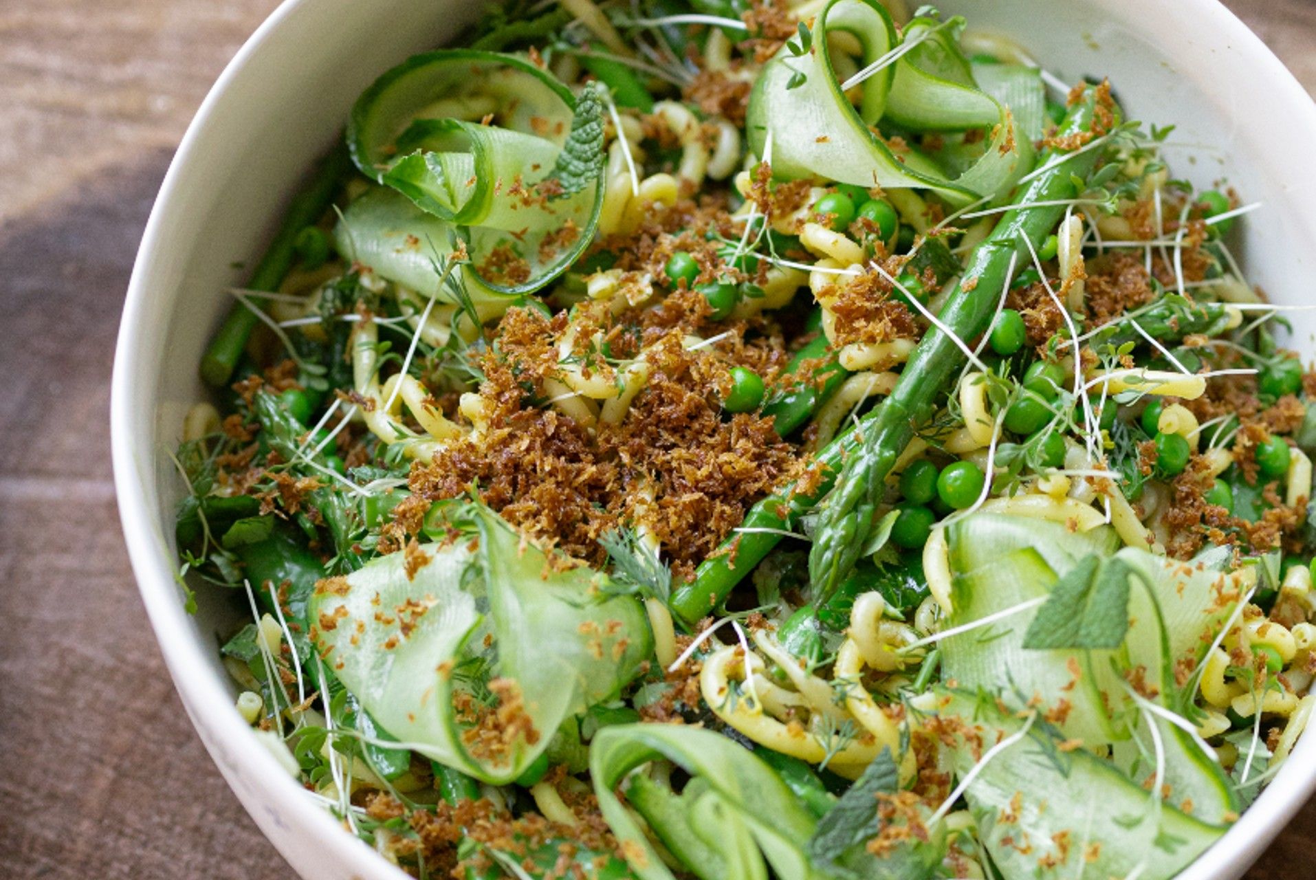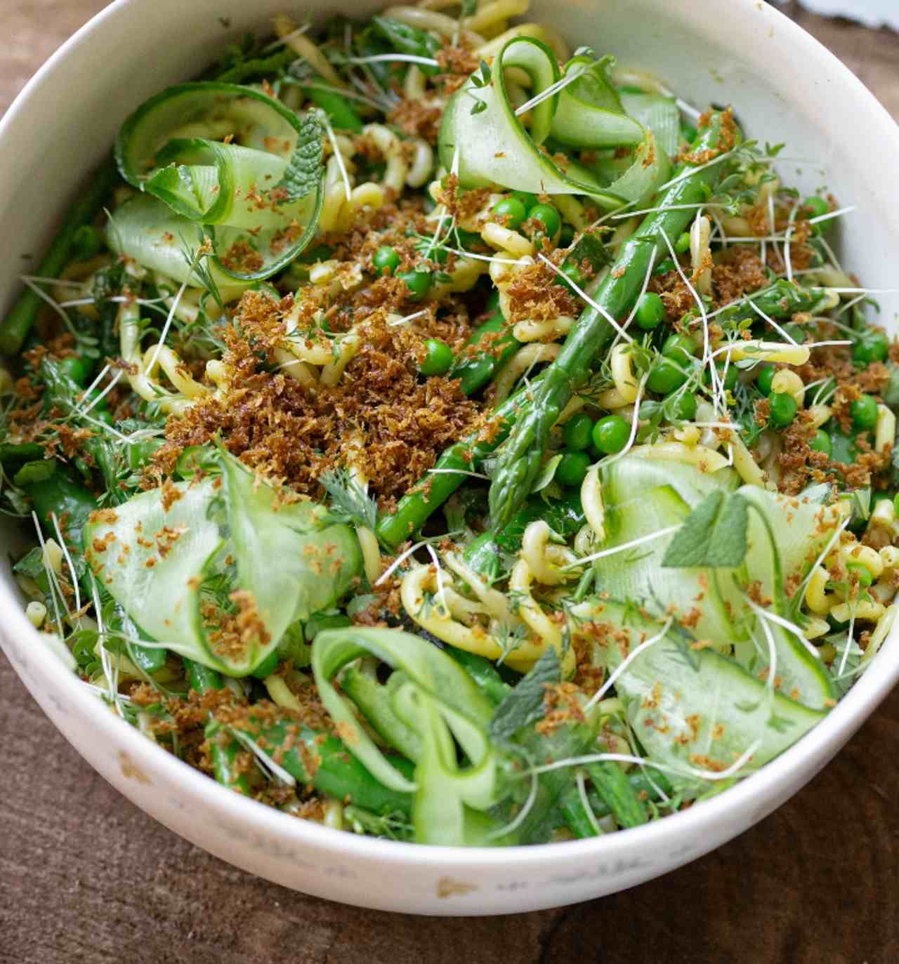 - Parsemez la salade de pâtes de pangrattato et de cressonnette et servez tiède.