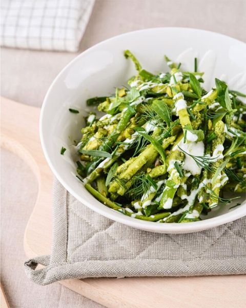 - Réunissez les avocats, les haricots verts, les asperges vertes et les pommes dans un bol.