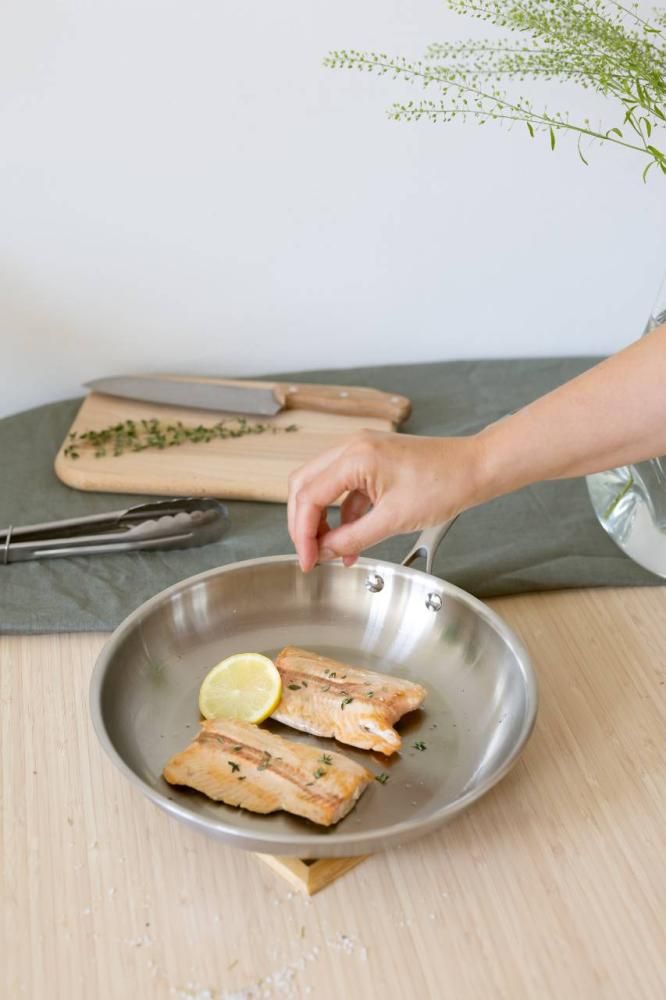 Onze roestvrijstalen pan is een duurzame pan van hoge kwaliteit, vrij van PFAS. Omdat er geen kwetsbare antiaanbaklaag in zit, is het niet erg als er krasjes inkomen. Bovendien bevat zo’n laag altijd kunststoffen: slecht voor het milieu tijdens de productie en ook niet fijn als ze in je eten terechtkomen. Gelukkig kan je in onze roestvrijstalen pannen prima koken en bakken zonder antiaanbaklaag!