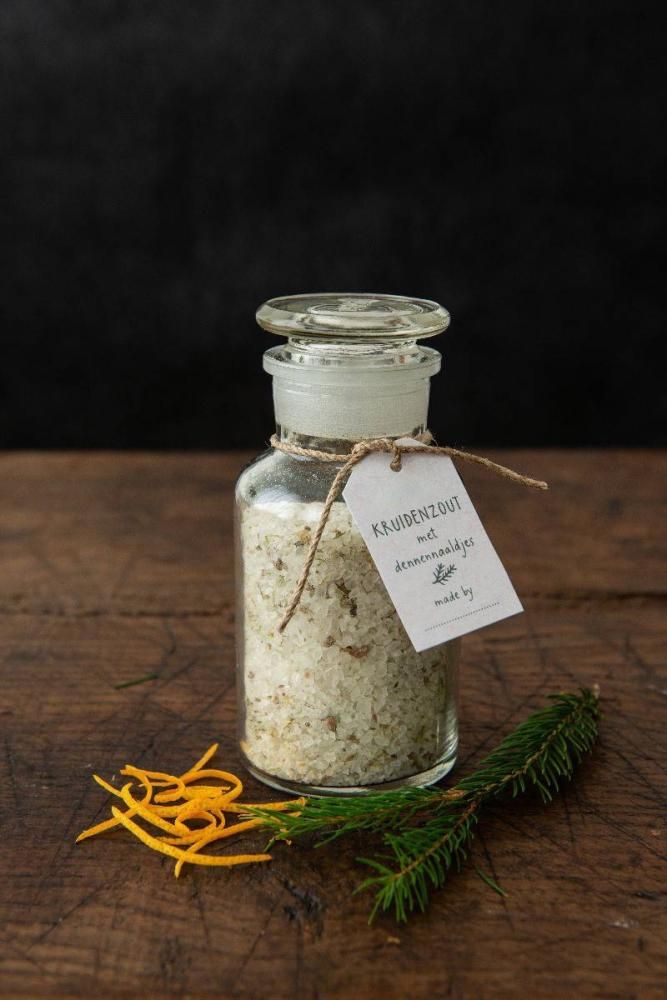 Knip de naaldjes in kleine stukjes. Doe ze met de rasp, jeneverbessen en 1 el zeezout in een vijzel. Stamp alles fijn tot het zout goed kleur krijgt. Meng met de rest van het zout. Spreid het mengsel uit in een platte ovenschaal. Laat ca. 4 uur drogen in de oven op 50 °C en vervolgens afkoelen. In een goed afgesloten, schoon potje is het zout heel lang houdbaar.