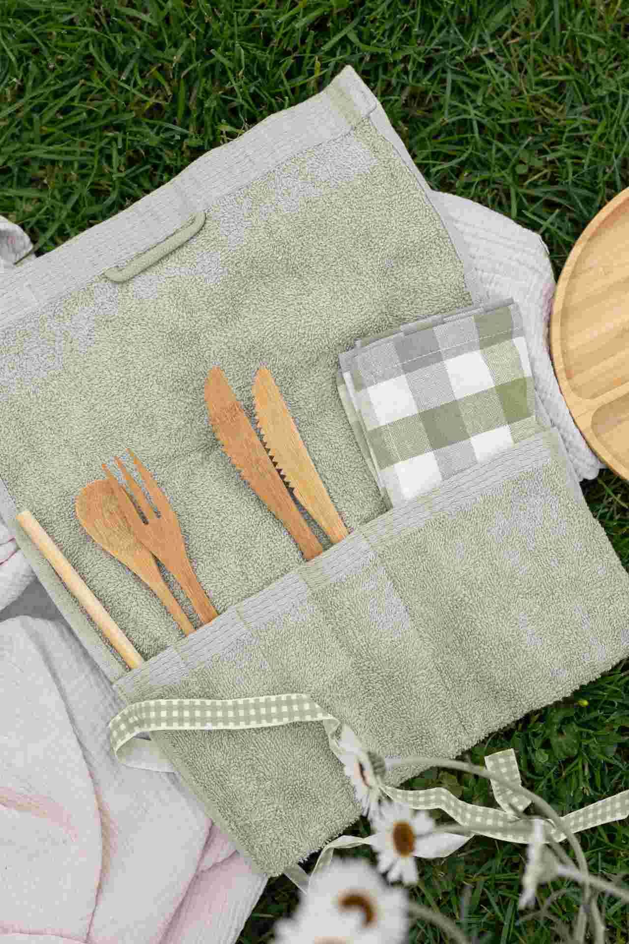 Voor bestek, rietjes en servetten: met deze DIY maak je van een gastendoekje een oprolbaar etui. Makkelijk om mee te nemen en zo heb je alles bij de hand voor een gezellige picknick!
