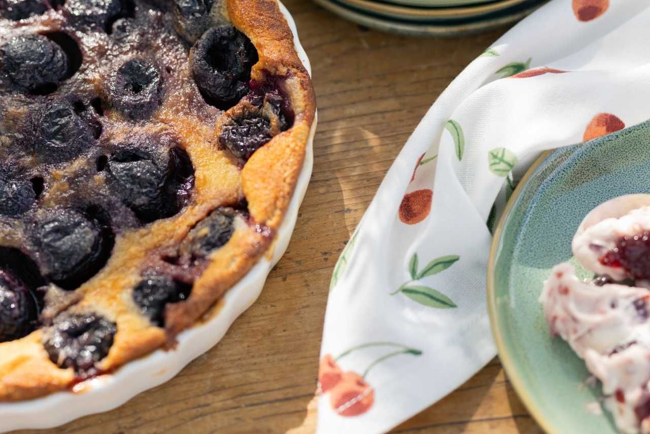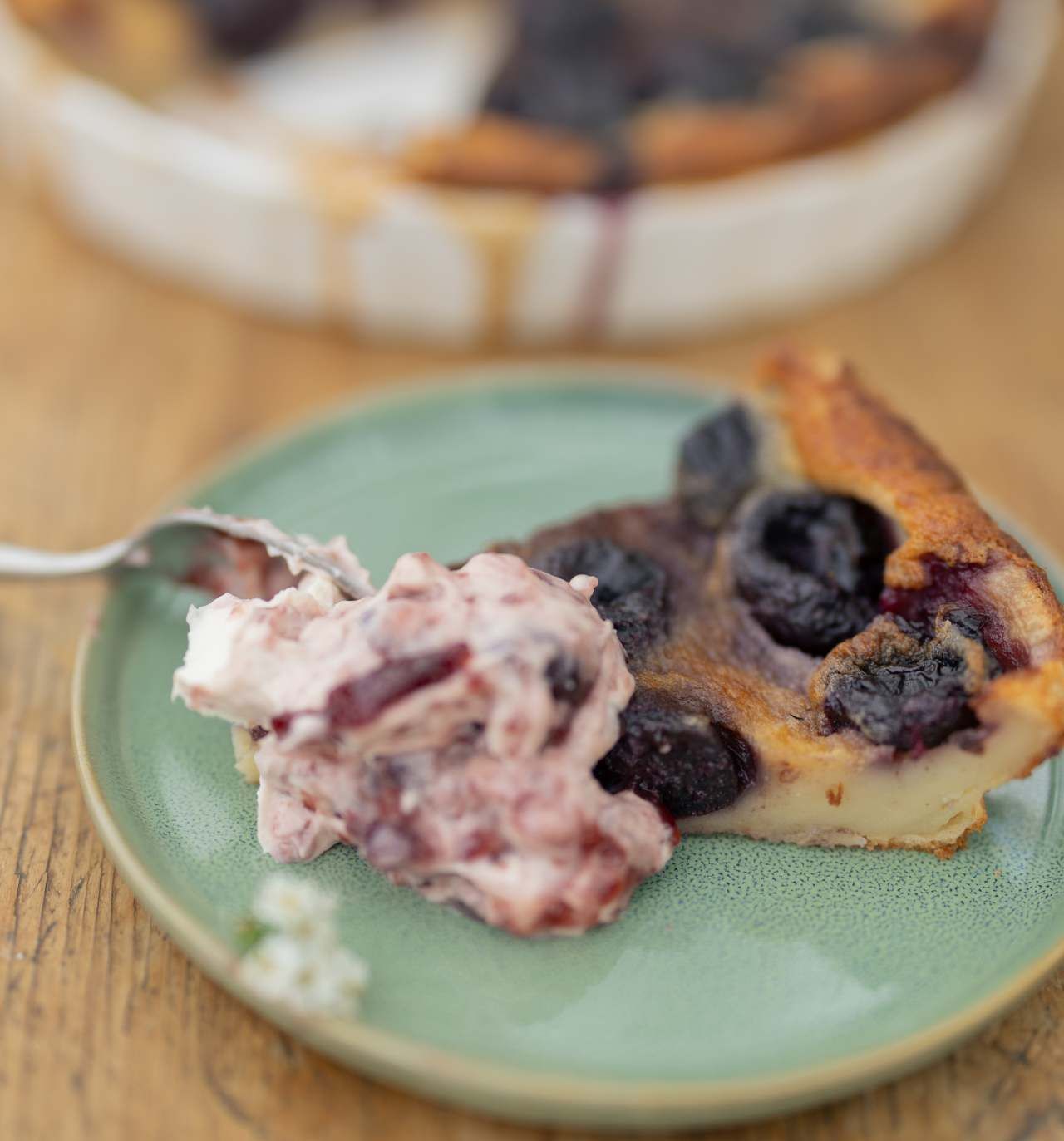 - Meng de confituur met de crème fraîche tot er mooie swirls ontstaan. Serveer bij de warme clafoutis.