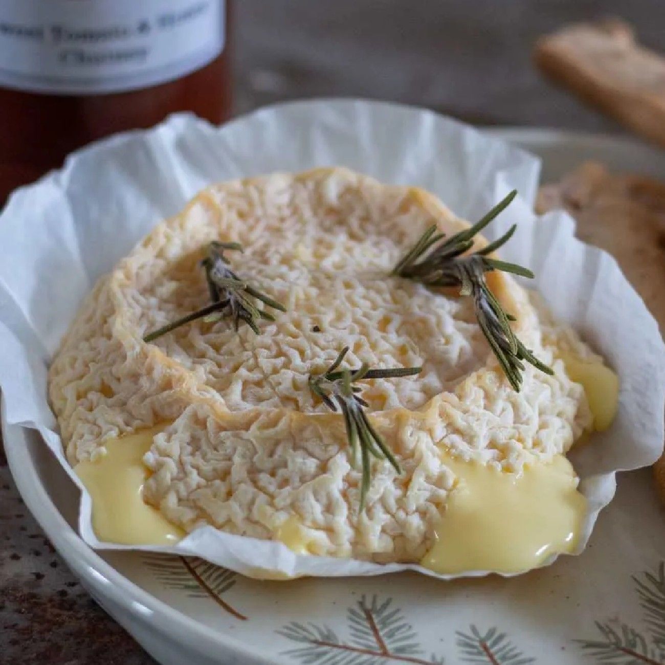 - Maak met een mes vier inkepingen in de kaas en steek er takjes rozemarijn en/of tijm in en plakjes knoflook.