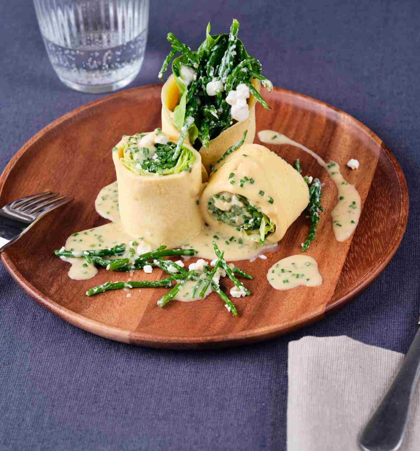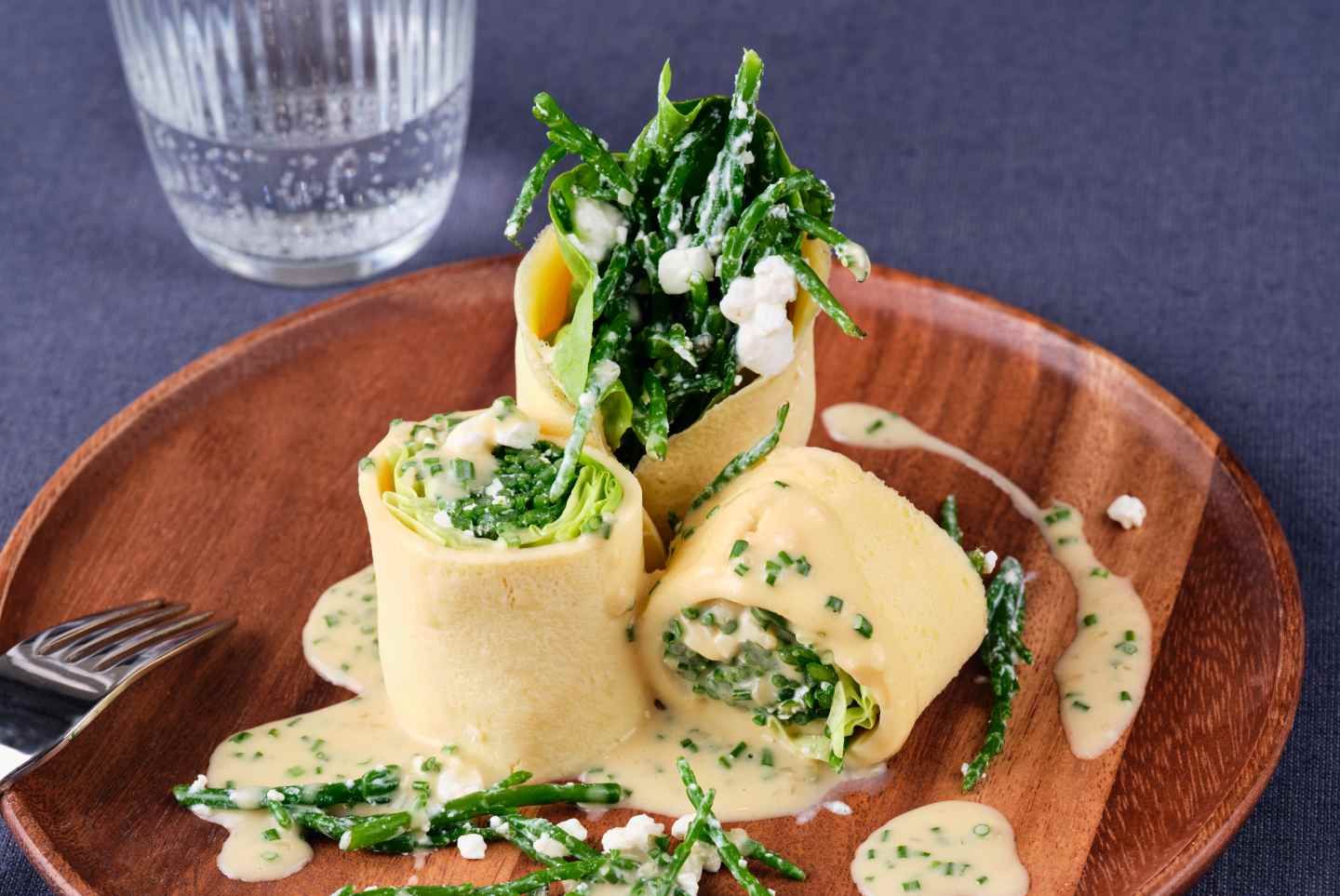 - Verdeel de zeekraal in de breedte over de kropsla. Schep de cottage cheese aan de zijkanten naast de zeekraal en rol de flensjes nu zo strak mogelijk op. Knoop de opgerolde flensjes voorzichtig vast met de bieslook, zodat je een strak rolletje krijgt.