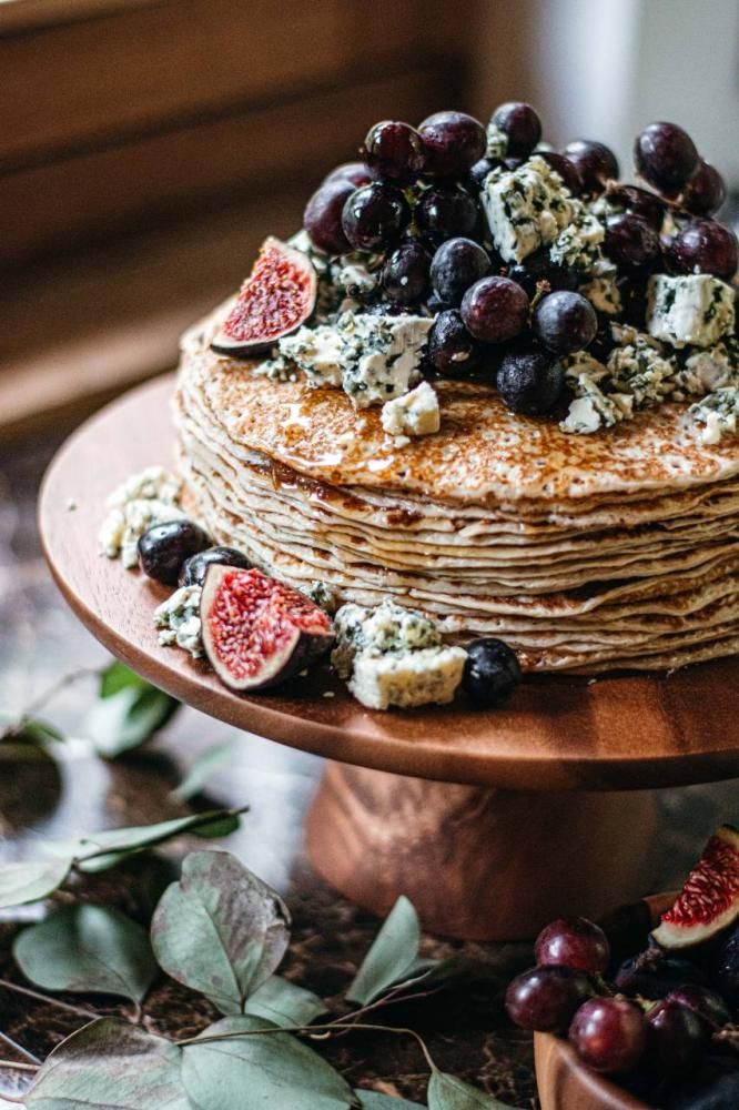 - Serveer kleine puntjes van de pannenkoekentaart als feestelijk - en hartig - dessert, bijvoorbeeld in plaats van een kaasplankje.