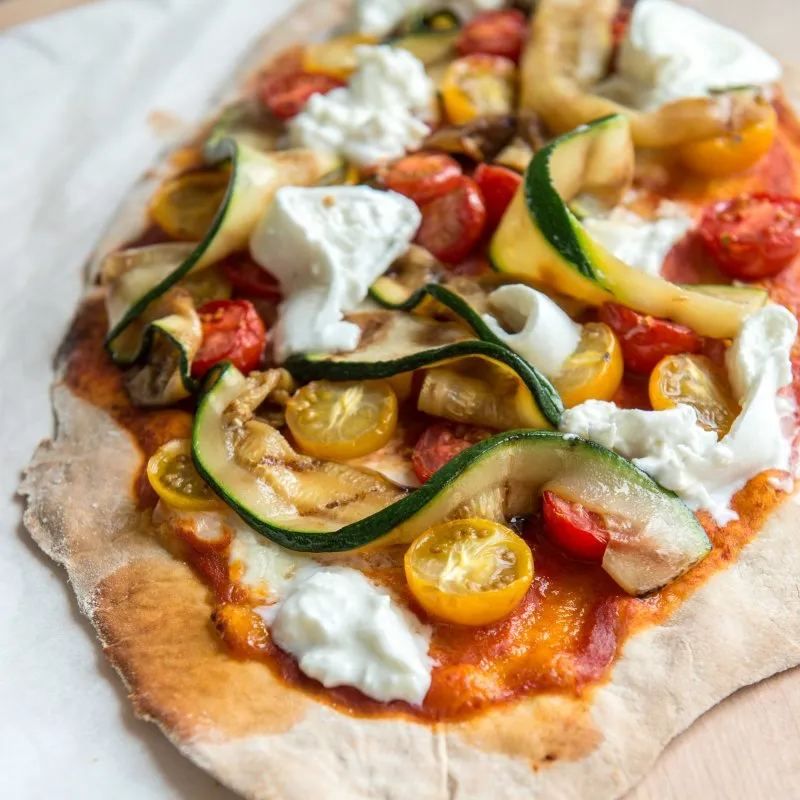Pizza met kerstomaatjes, gegrilde courgette en burrata