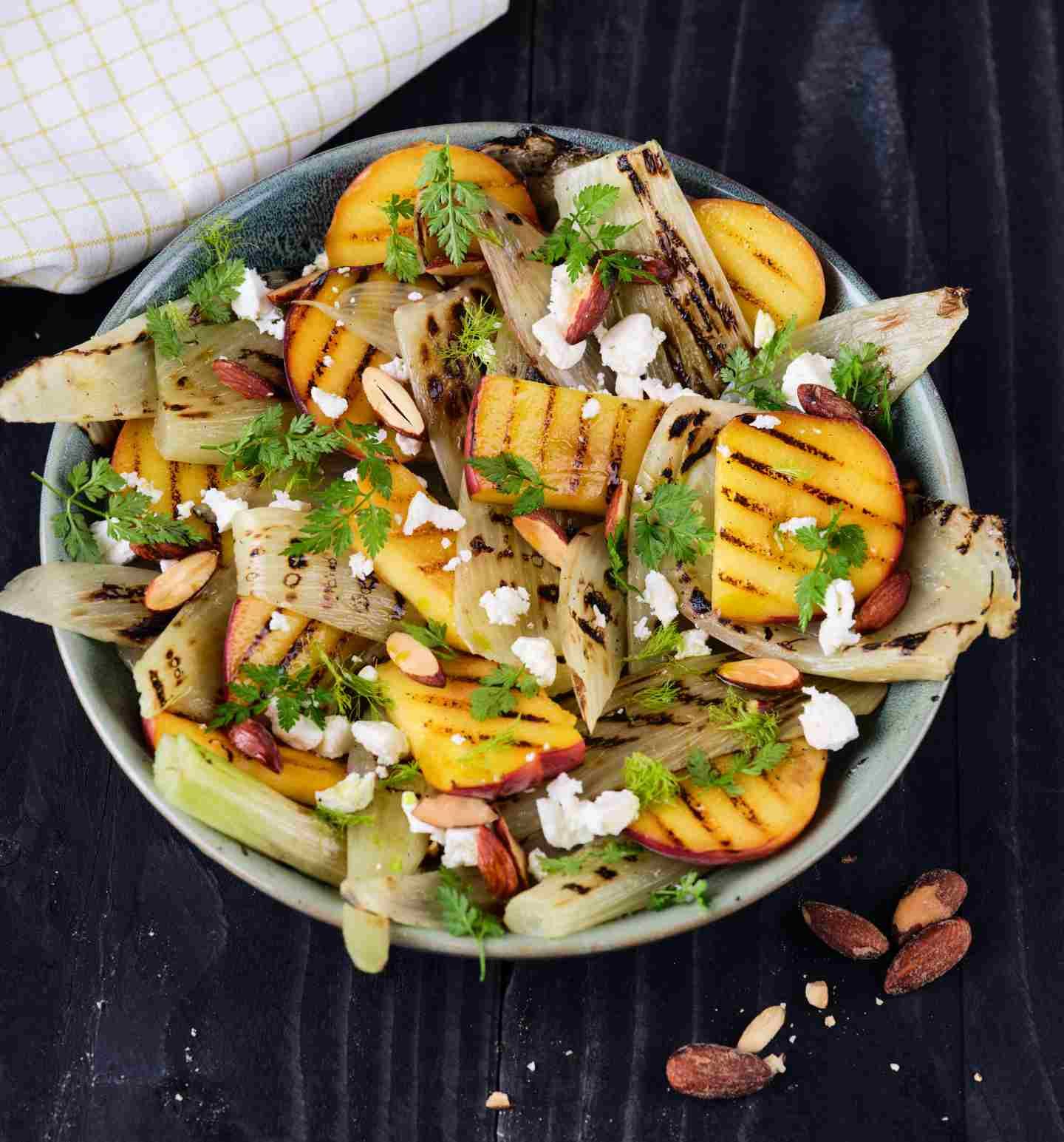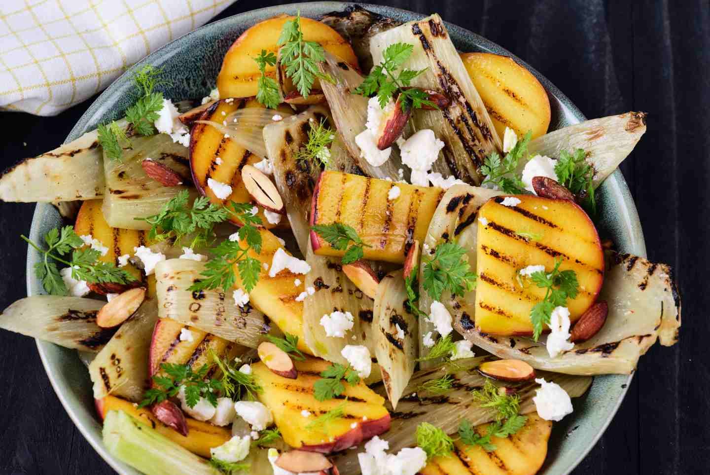 - Rooster de perziken 1 minuut per kant in de hete grillpan. Draai de plakjes halverwege een kwartslag zodat er een mooie ruit ontstaat.