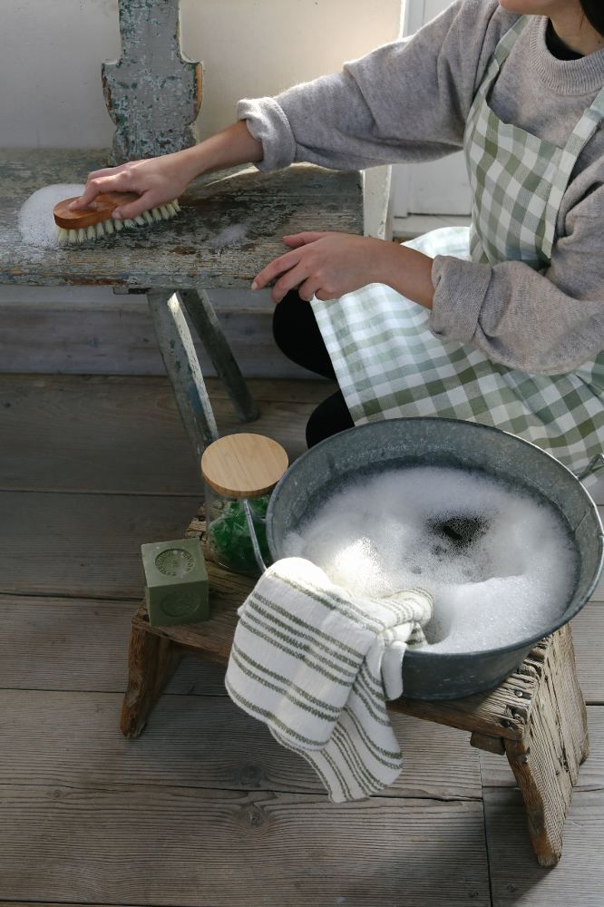 Tuinmeubels maken we grondig schoon met een sopje van zwarte zeep en een stevige borstel, zoals dit S-vormige model met een goede greep. Droog na met een schone doek.