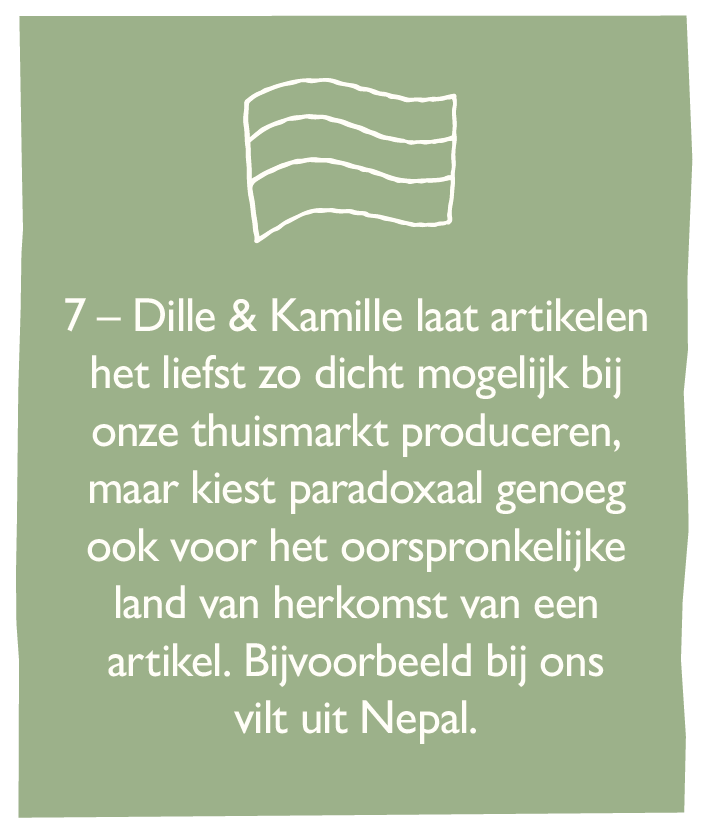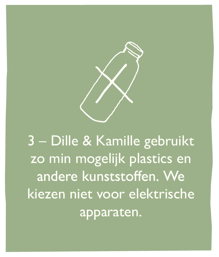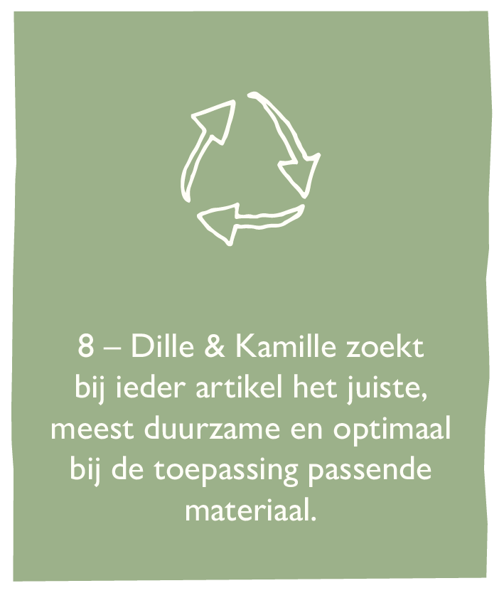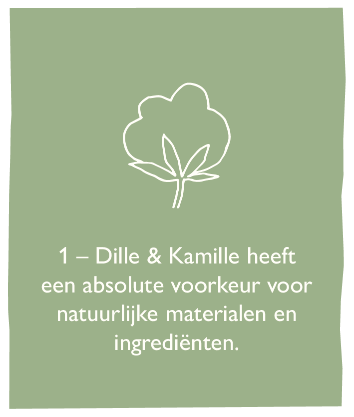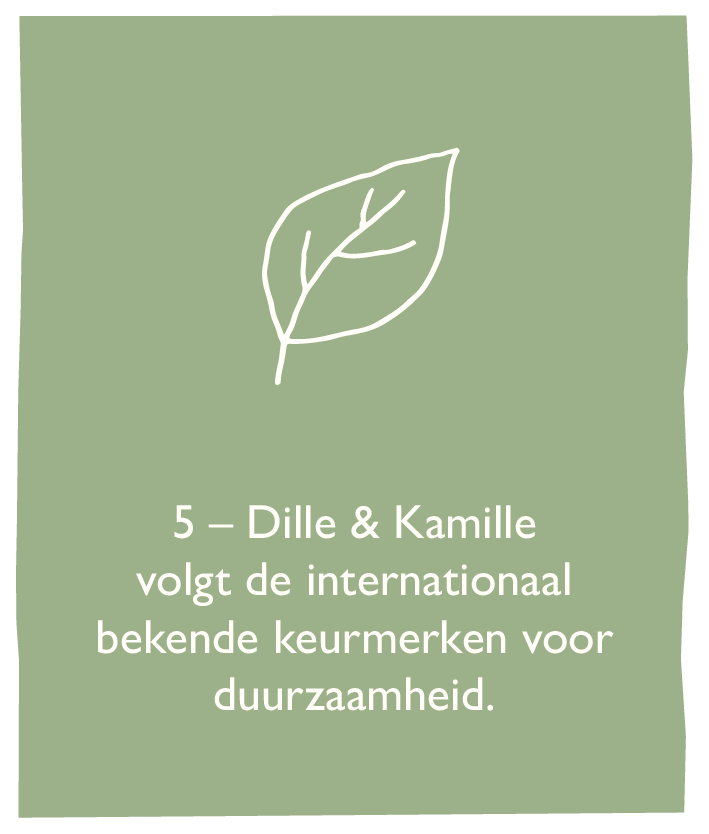 Al sinds de oprichting van Dille & Kamille kiezen we bij het samenstellen van ons assortiment voor kwaliteit en tijdloze vormgeving waarbij we een absolute voorkeur hebben voor natuurlijke materialen en ingrediënten. We kiezen ervoor om zo min mogelijk plastics en andere kunststoffen te gebruiken en zo min mogelijk verpakkingsmateriaal. We volgen de internationaal bekende keurmerken voor duurzaamheid, willen voor iedereen in de keten een eerlijke prijs en we zoeken bij ieder artikel het juiste, meest duurzame - en optimaal passende - materiaal.