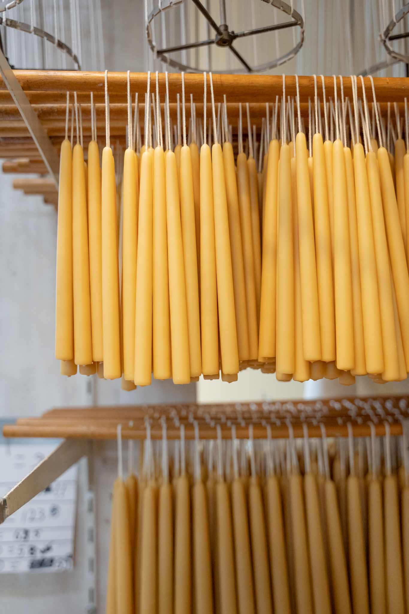 Handgemaakte bijenwaskaarsen In de kaarsenmakerij van Dipam worden onze bijenwaskaarsen met liefde gemaakt. Een klein team werkt hier op ambachtelijke wijze aan de kaarsen. Van het gieten van de wax tot het inpakken ervan – alles wordt met de hand gedaan.
